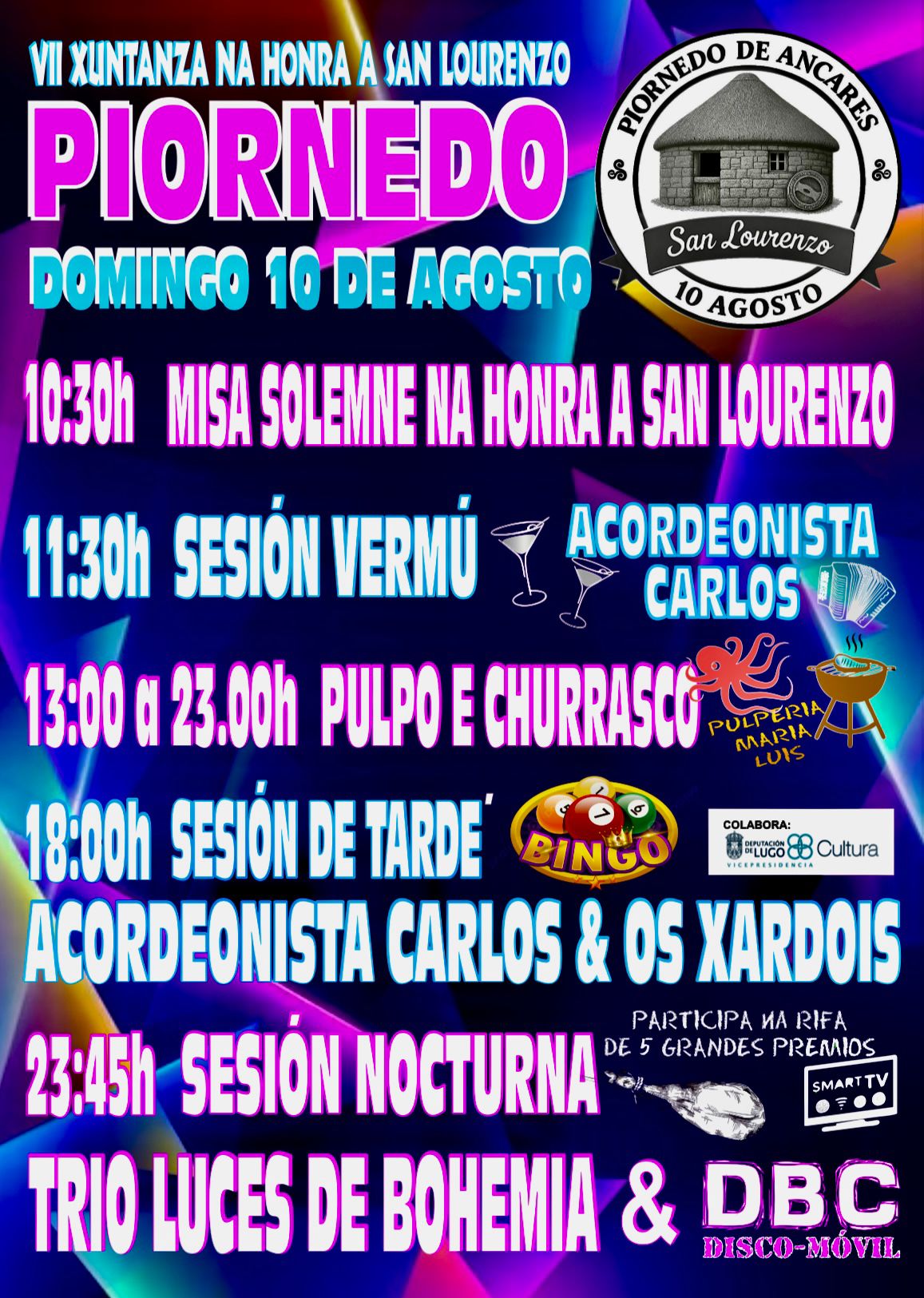 Misa solemne na honra a San Lourenzo, sesión vermú, pulpo, churrasco, sesión de tarde e sesión nocturna. Moita música durante todo o día e unha rifa con 5 grandes premios.