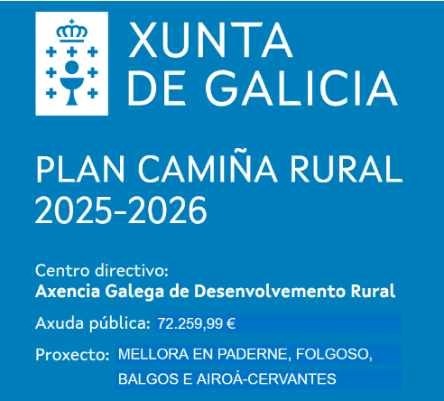 O Concello de Cervantes, a través da Resolución do 30 de decembro de 2024 pola que se aproban as bases reguladoras das axudas financiadas ao abeiro do plan Camiña rural para o período 2025-2026 e se convocan as correspondentes ao ano 2025, mediante tramitación anticipada de gasto (código de procedemento MR701E) (DOG nº 19 do 29 de xaneiro de 2025), está a levar a cabo a obra MELLORA EN PADERNE, FOLGOSO, BALGOS E AIROÁ-CONCELLO CERVANTES, con unha cantidade total subvencionada de 72.259,99 €, sendo o custe total do proxecto de 92.617,03 €